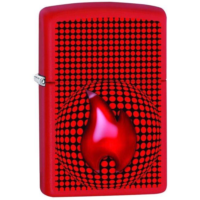 Metal lighter in a red matte finish with a print. This flint lighter has to be filled with lighter fluid before using. The brand Zippo is famous about their quality and lifetime garantee.