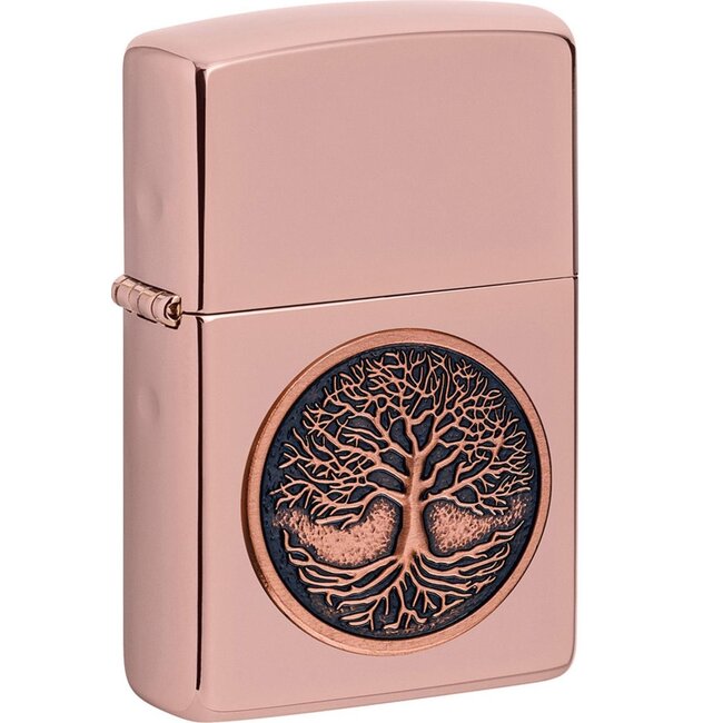 Metal lighter in a rose gold finish with an emblem. This flint lighter has to be filled with lighter fluid before using. The brand Zippo is famous about their quality and lifetime garantee.
