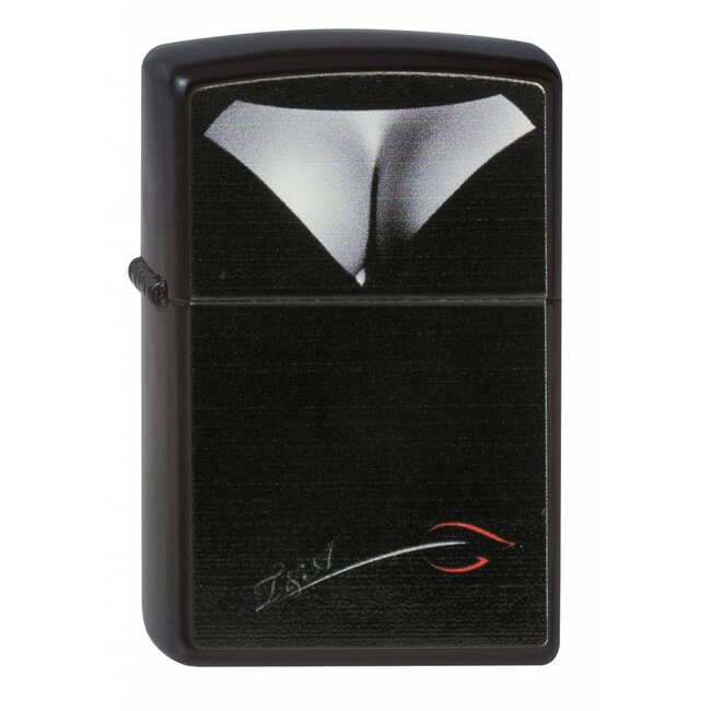 Metal lighter in a black matte finish with a print. This flint lighter has to be filled with lighter fluid before using. The brand Zippo is famous about their quality and lifetime garantee.