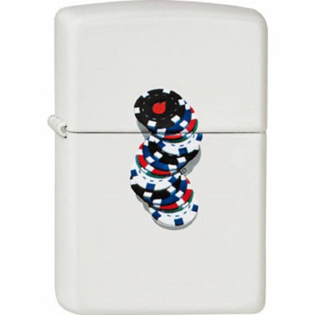 Metal lighter in a white matte finish with a print. This flint lighter has to be filled with lighter fluid before using. The brand Zippo is famous about their quality and lifetime garantee.