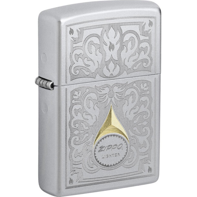 Metalen aansteker met een zilverkleurige laag (satin finish) gegraveerd. Dit is een vuursteen aansteker die gevuld dient te worden met aanstekerbenzine. Het merk Zippo heeft een zeer goede reputatie opgebouwd door de jaren heen door hun levenslange garantie en hun uitstekende kwaliteit.